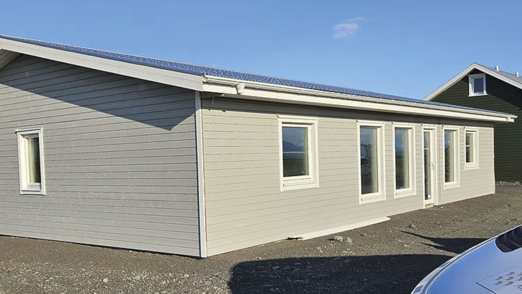 Sunnan við Hofsós var sett upp hús frá okkur. Eigendurnir vildu dekkja húsið eftir uppsetningu. En það var ekkert mál þar sem grunnliturinn er frekar mildur sem auðvelt er að þekja yfir.